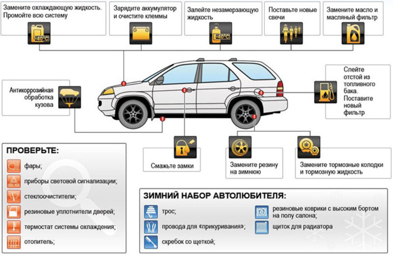 Перед стартом зимнего сезона автомобиль необходимо подвергнуть полному техническому обслуживанию. Это включает замену на новые зимние масла и смазочные материалы, а также обработку как сухих, так и смазанных элементов салона и дверных механизмов. Кузов следует тщательно вымыть и очистить как снаружи, так и изнутри, а лакокрасочное покрытие обработать защитным декоративным полиролем для консервирования.