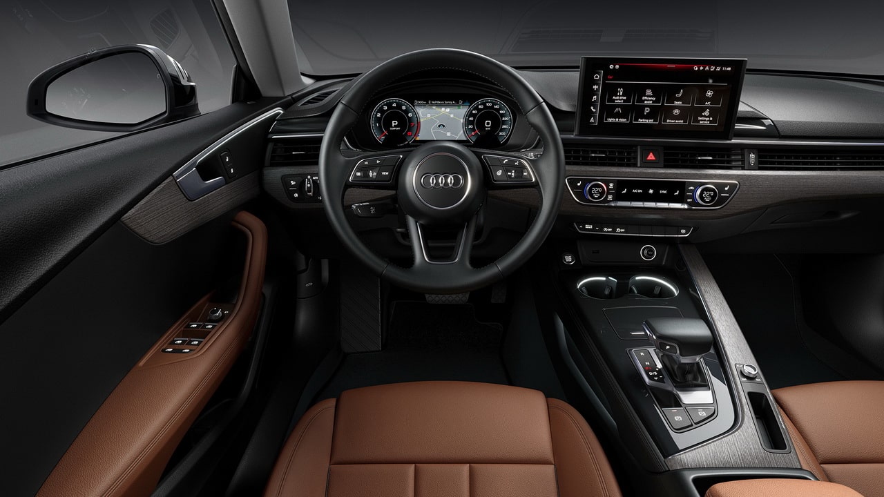 Салон A5 по-прежнему доступен в черном, коричневом и светло-сером цветах. Дизайн остался прежним. Среди изменений можно выделить увеличенный экран мультимедийной системы и отсутствие дополнительной панели управления между центральной консолью и туннелем — все функции теперь перенесены в голосового помощника и обновленный сенсорный экран.