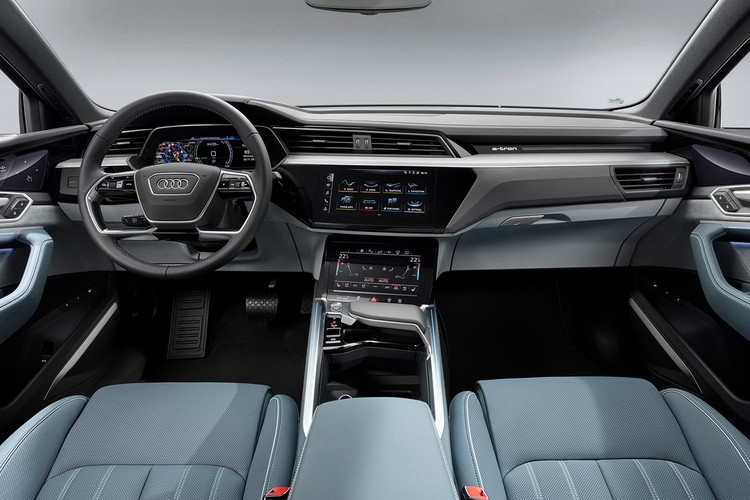 Интерьер Audi e-tron Sportback 2020 года впечатляет наличием пяти экранов. Два из них размещены по бокам панели и представляют собой экраны для зеркал заднего вида. Еще два находятся на центральной консоли.