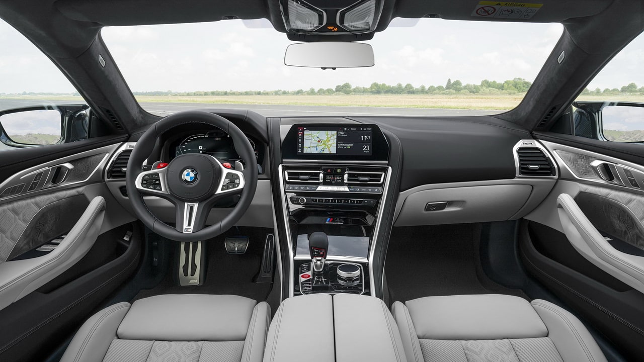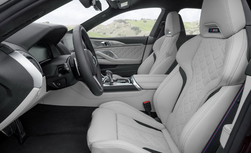 При создании интерьера БМВ М8 Гран Купе (F93) немецкие дизайнеры явно сделали акцент на спортивном стиле.