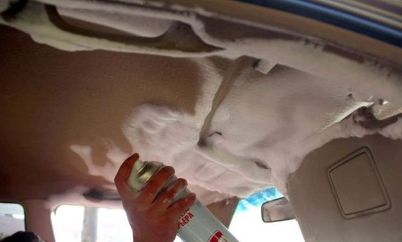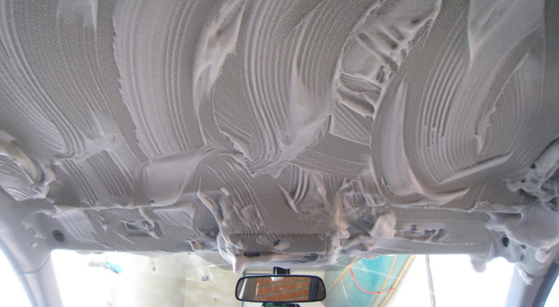 Удаление использованного средства осуществляется с помощью влажных поролоновых губок. Процесс следует повторять несколько раз, пока губки не перестанут загрязняться в ходе работы по потолку. Это будет свидетельствовать о том, что остатки средства полностью устранены, и потолок стал чистым. Работать нужно в одном направлении — от переднего стекла к заднему.