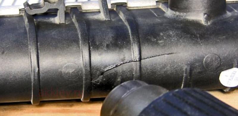 Возвращаемся к снятому радиатору. Если утечка возникла в пластиковой зоне, то можно считать, что половина работы уже выполнена. Теперь нужно подготовить поверхность и отправиться в магазин за специальным клеем или холодной сваркой.