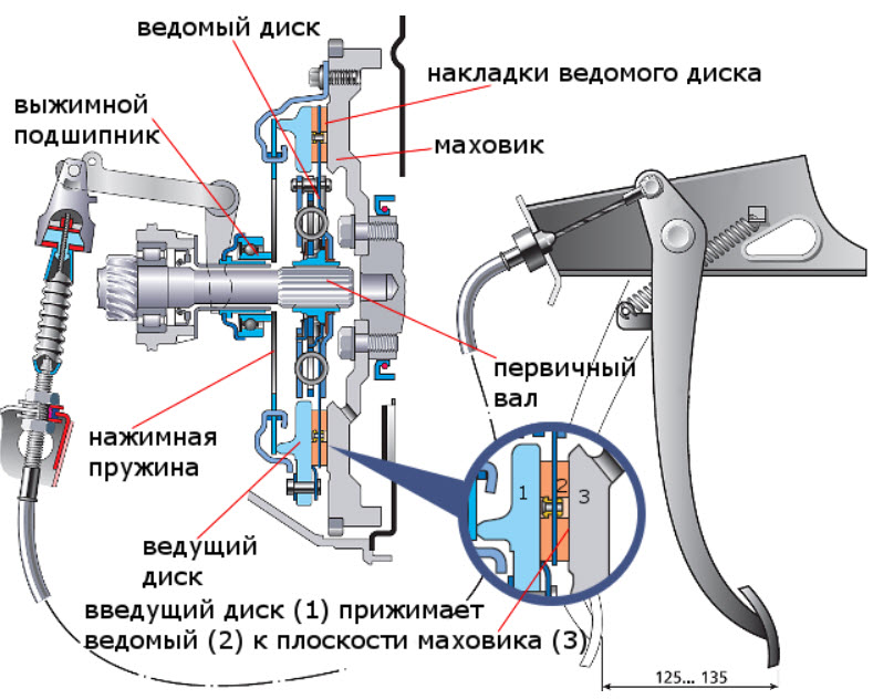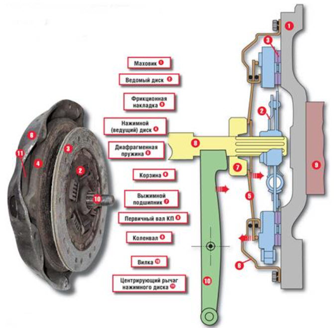| Увеличенный свободный ход педали сцепления или ее «мягкость» | Неправильная регулировка привода сцепления, износ выжимного подшипника или корзины сцепления | Регулировка привода сцепления. При износе — замена соответствующих деталей. |