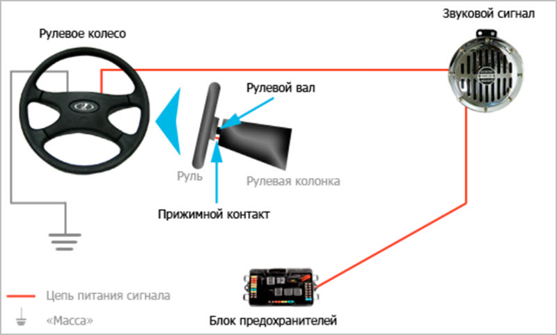 | Неисправна кнопка клаксона | Проверить кнопку на работоспособность (можно попробовать замкнуть контакты напрямую, если есть доступ). При неисправности заменить. | |