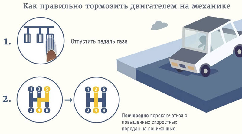 В случае механической коробки передач процесс достаточно прост: нужно убрать ногу с педали акселератора и постепенно снижать скорость автомобиля, одновременно переключаясь на более низкие передачи.