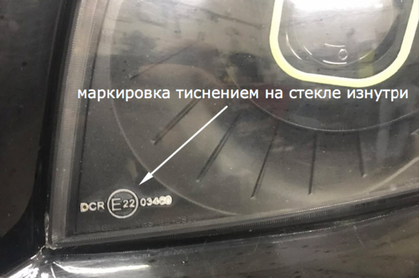 Существует два варианта расположения маркировки: на защитных стеклах оптики и на обратной стороне пластикового корпуса фары.