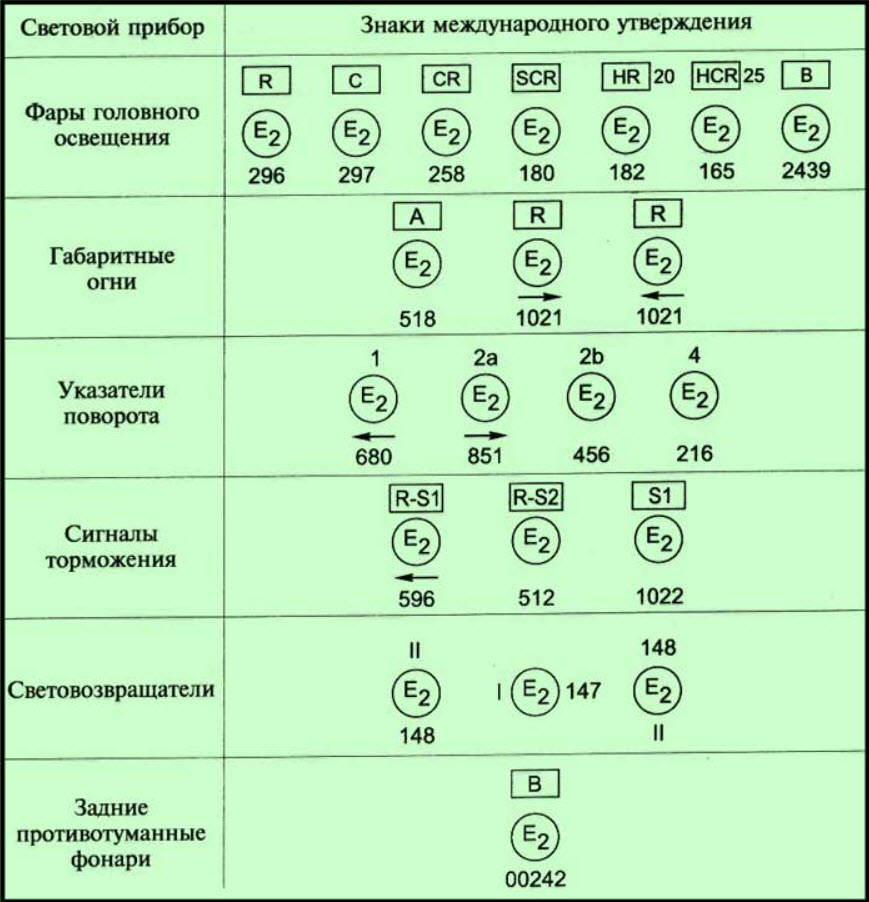 | На корпусе фары | Цифры рядом с буквой «E» | Код страны, выдавшей сертификат (например, E1 — Германия, E2 — Франция) |