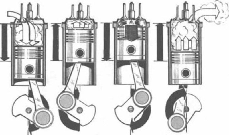 У четырехтактного двигателя процессы газообмена четко разделены на этапы. В фазе впуска поршень движется вниз, приближаясь к коленчатому валу, и создает максимальное пространство в цилиндре.