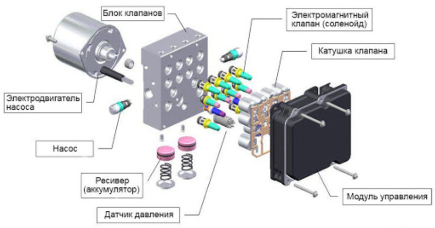 Для выполнения команд электронного блока, отвечающего за изменение давления в тормозных системах, необходимы устройства, которые преобразуют электрические сигналы в гидравлические силовые воздействия.