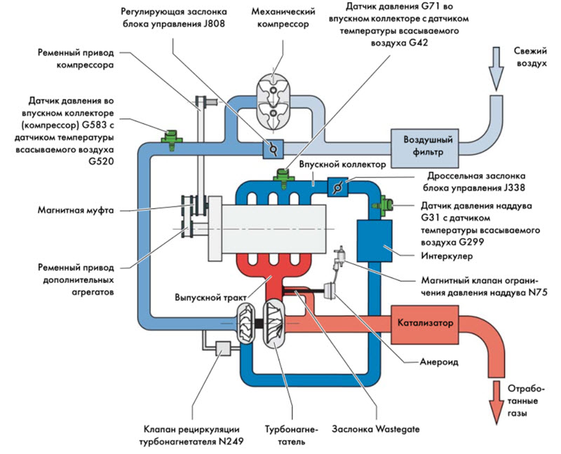 Поэтому на многих двигателях этой линейки применяется двойная система наддува, при которой сначала с помощью электромагнитной муфты и дополнительного байпасного клапана подключается механический роторный компрессор, приводимый в действие ремнем от коленчатого вала.