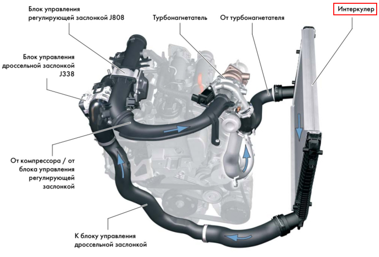 Повышенное давление наддува требует эффективного охлаждения воздуха, который поступает в цилиндры. При его нагреве снижается устойчивость двигателя к детонации, а также ухудшается топливная экономичность из-за уменьшения плотности горячего газа на впуске. В связи с этим в двигателях устанавливается интеркулер – дополнительный радиатор, оснащенный жидкостным теплообменником.