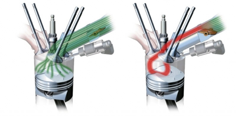Турбонаддув не привнес значительных изменений в процесс организации сгорания. Двигатели применяют несколько методов для повышения топливной эффективности, используя врожденные преимущества прямого впрыска: