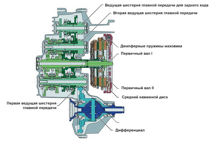 Коробка ДСГ соединена с двигателем через два сцепления, расположенных параллельно. Нечетные передачи и задняя передача работают через одно сцепление, в то время как четные передачи – через другое. Такая конструкция позволяет осуществлять плавное переключение передач без потери мощности, обеспечивая непрерывную передачу крутящего момента от двигателя к ведущим колесам.