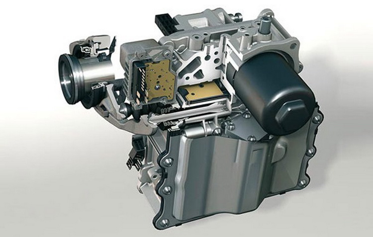 Управление обоими сцеплениями и переключением передач осуществляется с помощью блока управления, который включает в себя гидравлические и электронные компоненты, а также датчики. Этот блок называется Мехатроник и размещается в картере коробки передач.