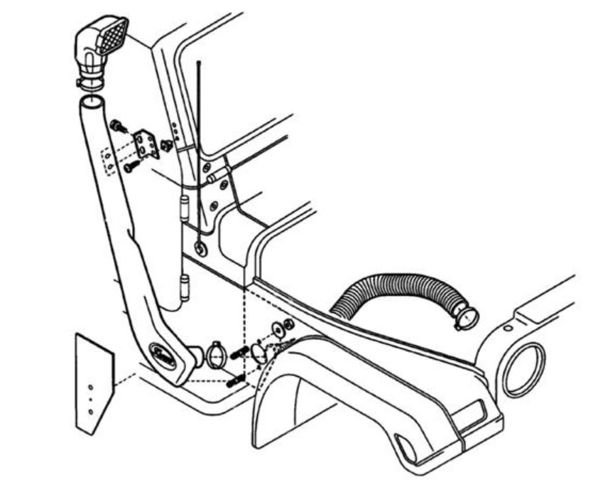 Вся эта система фиксируется к крылу, брызговику, стойке и рамке лобового стекла. Гофрированный шланг надежно закреплен хомутами с обеих сторон на патрубках шноркеля и корпусе воздушного фильтра.