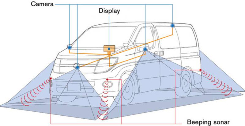Изображение с камер поступает в блок обработки видео, далее процессор производит коррекцию и совмещает четыре изображения в одно, тем самым позволяя водителю получить взгляд на машину сверху. Таким образом получается одно круговое изображение с четырех камер — так называемая камера кругового обзора.
