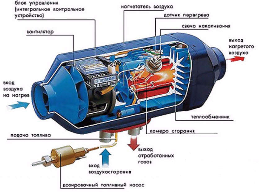 Это самая простая и экономичная система, устанавливаемая прямо в салоне автомобиля. Она функционирует как тепловой вентилятор, или, если хотите, как фен, но в отличие от него, энергия поступает не из электросети, а из бака с жидким топливом.