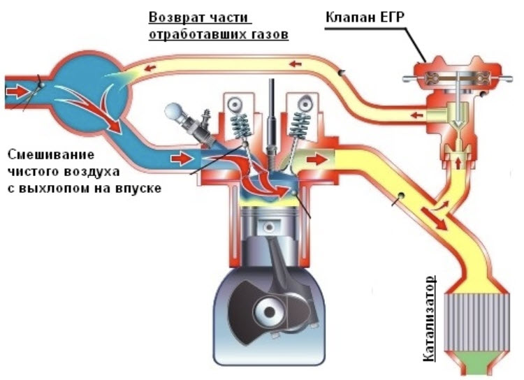 | Принцип действия | Клапан EGR открывается, позволяя выхлопным газам смешиваться со свежим воздухом и топливом. Инертные газы снижают концентрацию кислорода, замедляя горение. | |