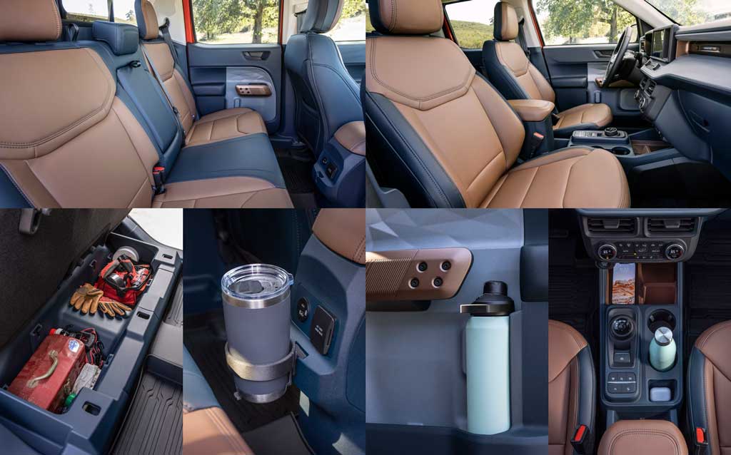 Салон нового Ford Maverick 2022 года оформлен в синем цвете с оранжевыми акцентами на дверных ручках и центральной консоли, что создает интересный визуальный эффект.