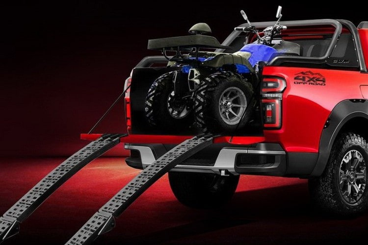 Внешний вид автомобиля привлекает внимание благодаря множеству декоративных деталей и элементов, выполненных из черного пластика. Задние фонари также оснащены светодиодами. Интересно, что в задней части пикапа предусмотрено место для квадроцикла. Инженеры добавили лестницу, что значительно упрощает процесс его загрузки.