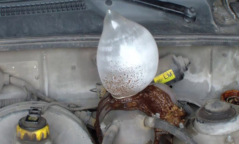 Выход выхлопа в расширительный бачок можно зафиксировать, надев на горловину без пробки резиновую перчатку или воздушный шарик. Если они начинают наполняться, это свидетельствует о наличии газа.