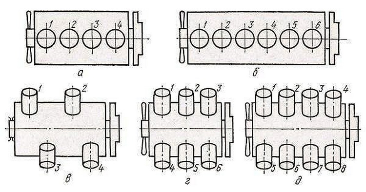 | V-образный (V) | Под углом друг к другу | От маховика, сначала один ряд, затем другой (1-3-5-2-4-6) |