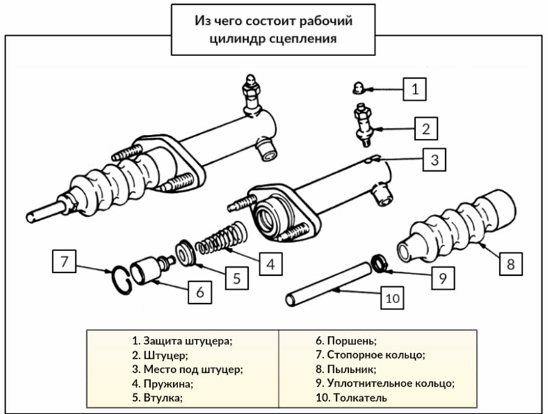 Все вышеперечисленное также относится и к рабочему цилиндру. Доступ к нему достаточно прост, его стоимость ниже, чем у главного цилиндра сцепления, а выбор на рынке весьма разнообразен. Хотя теоретически существует возможность ремонта, если удастся найти качественный ремкомплект.