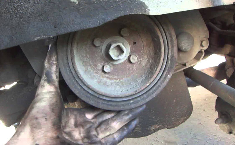Следующий шаг — найти болт, который фиксирует шкив. Обычно его можно обнаружить, заглянув под автомобиль рядом с правым колесом. Для этого потребуется пневмогайковерт и необходимо будет снять колесо.