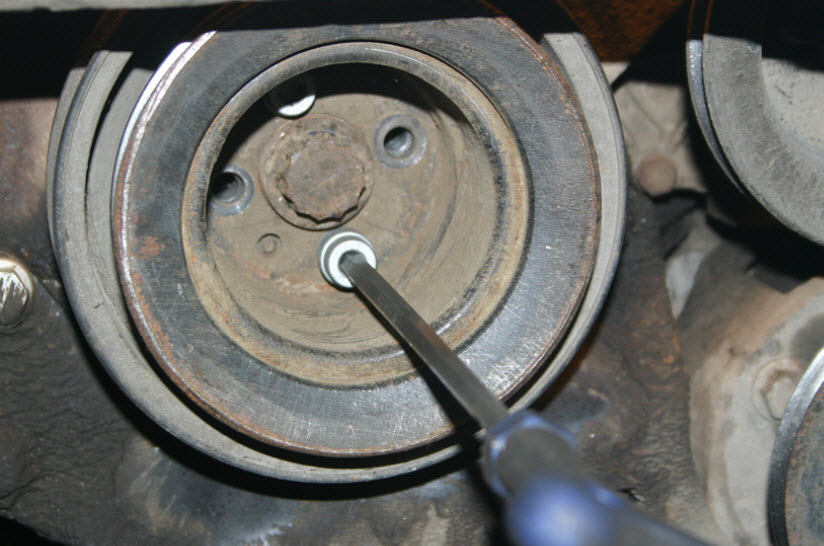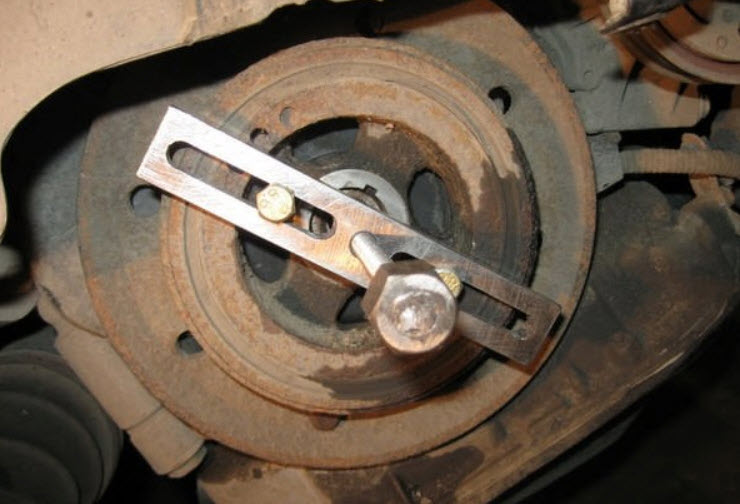 Как снять шкив коленвала? Удерживая гайку стержня, проверните двигатель. Если болт с фланцем застрял, обрежьте его шлифовальной машиной, поворачивая шкив примерно на 30 градусов за раз, чтобы ослабить натяжение.