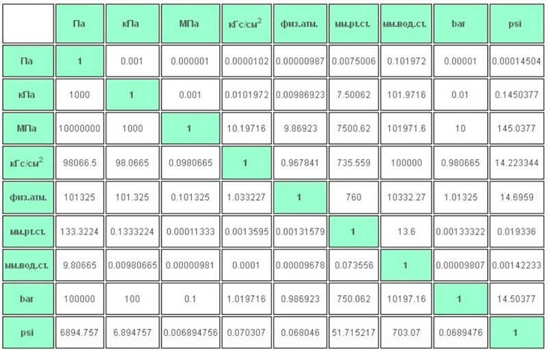 Таблицы для преобразования конкретных значений из одних единиц в другие. Обычно в таких таблицах числа представлены парами в определенном диапазоне от минимального до максимального давления, на которое рассчитана таблица.