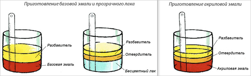 | 2 | Определение пропорций | Изучите инструкцию к краске и отвердителю/разбавителю, чтобы точно знать необходимые пропорции смешивания. |