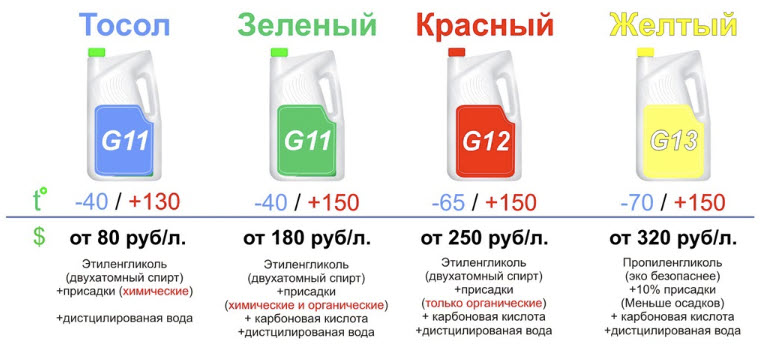 Наиболее распространённые цвета — зелёный, красный, жёлтый, синий и оранжевый. Однако важно помнить, что цвет не является абсолютным индикатором, так как разные производители могут использовать различные оттенки для одного и того же типа антифриза.