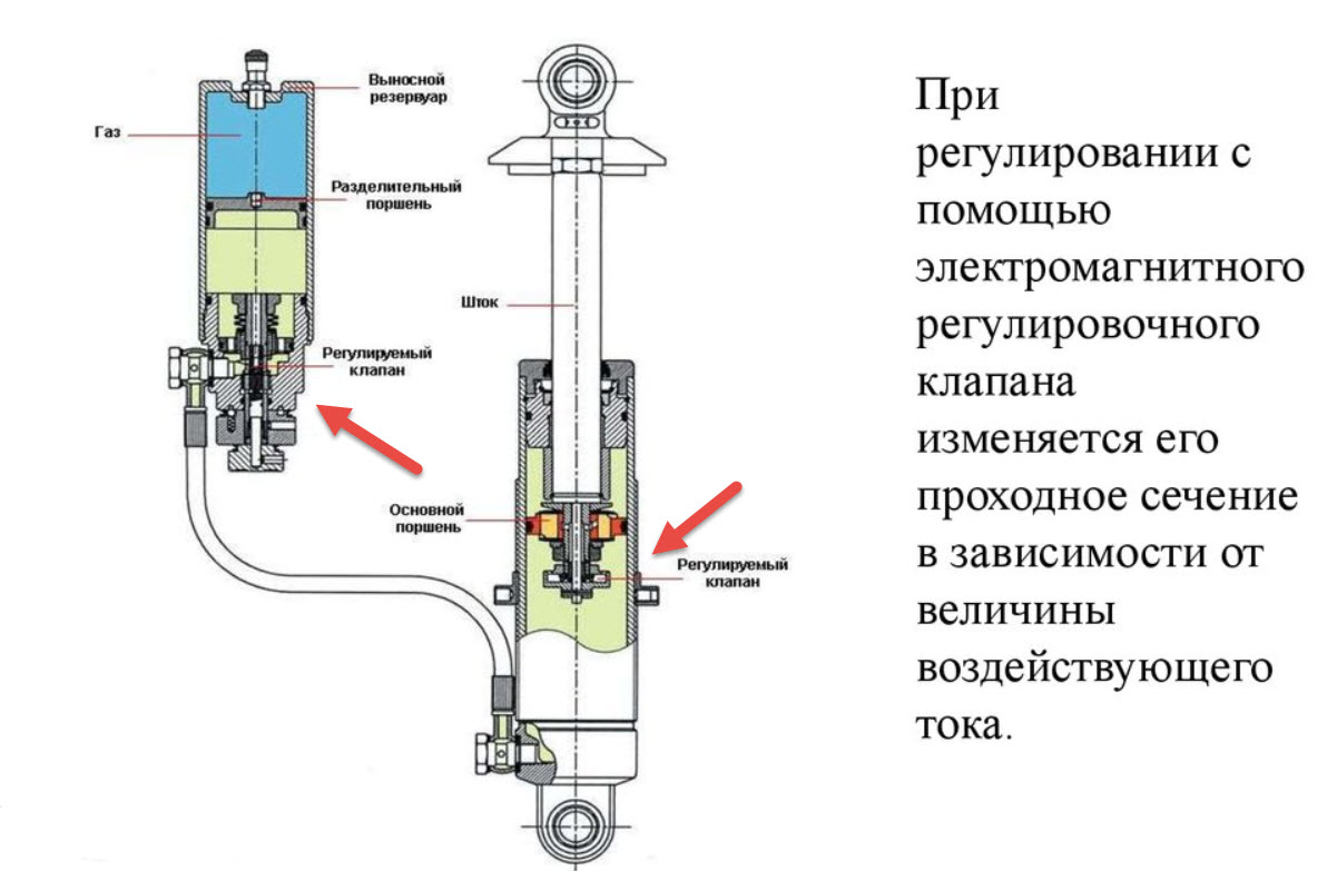 В первом случае демпфирующие свойства корректируются за счёт клапанов, встроенных в амортизаторы, которые изменяют свою форму под воздействием управляющего электрического тока.