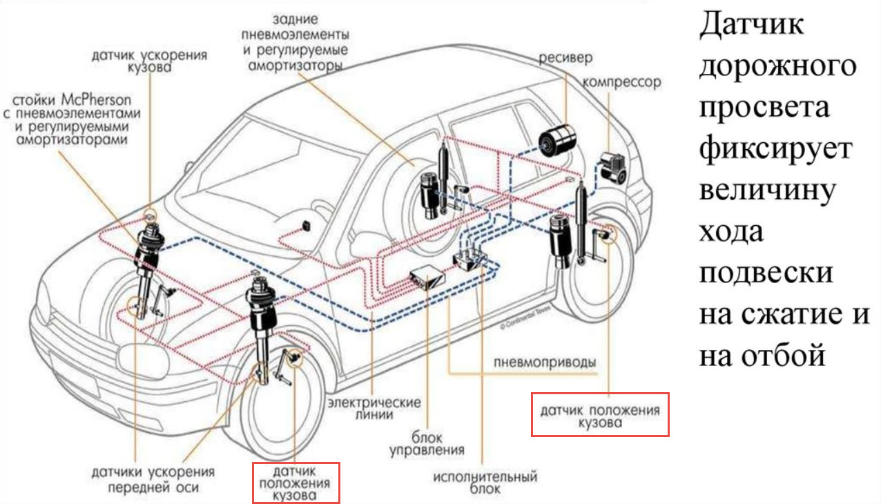 - датчики высоты кузова, расположенные на каждом колесе или оси, а также для общего клиренса кузова;