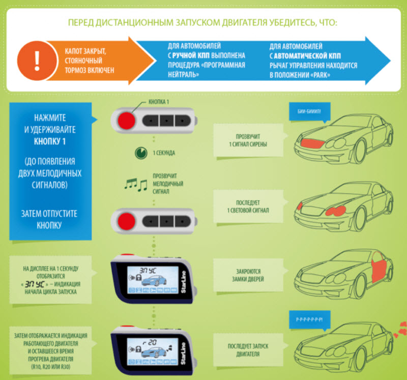 Заранее включаются необходимые устройства для обогрева или охлаждения салона. Иммобилайзер срабатывает, автомобиль должен находиться с разомкнутой трансмиссией и на стояночном тормозе.