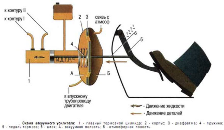 Единственное, что может поддержать ногу водителя, стремящегося замедлить движение автомобиля, — это вакуумный усилитель тормозов (ВУТ), который располагается между педалью и первым гидравлическим элементом в системе, заканчивающейся тормозными колодками.