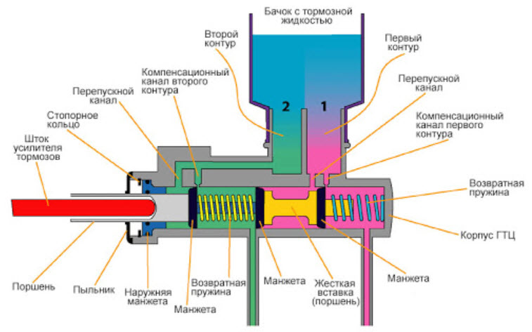 | Разделитель контуров | Разделяет тормозную систему на два независимых контура (обычно передний и задний), обеспечивая безопасность. | Внутренняя конструкция цилиндра, позволяющая каждому поршню работать независимо. |