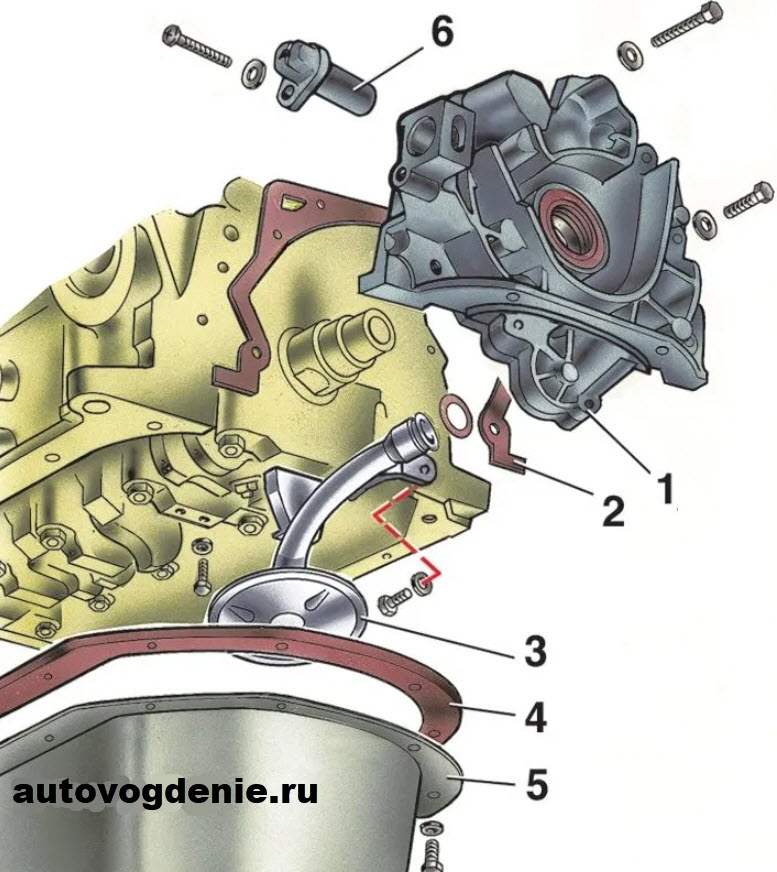 1 — насос; 2 — прокладка; 3 — маслоприемник; 4 — прокладка поддона; 5 — картер; 6 — датчик коленвала.