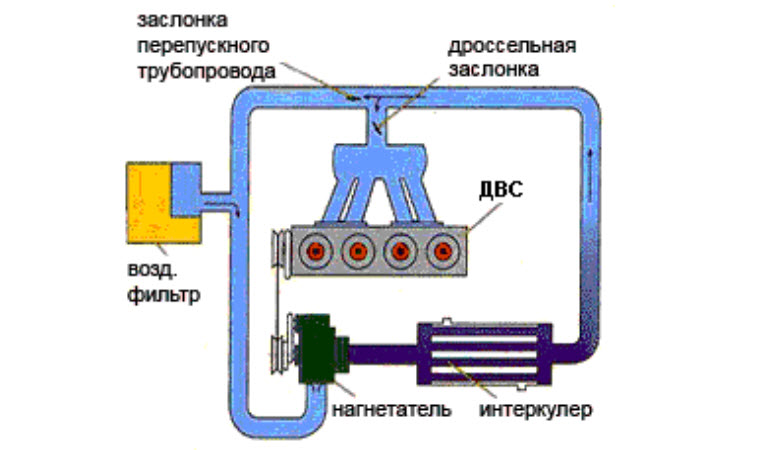 | Впускной патрубок | Подача атмосферного воздуха в нагнетатель | Труба, соединяющая воздушный фильтр с нагнетателем |