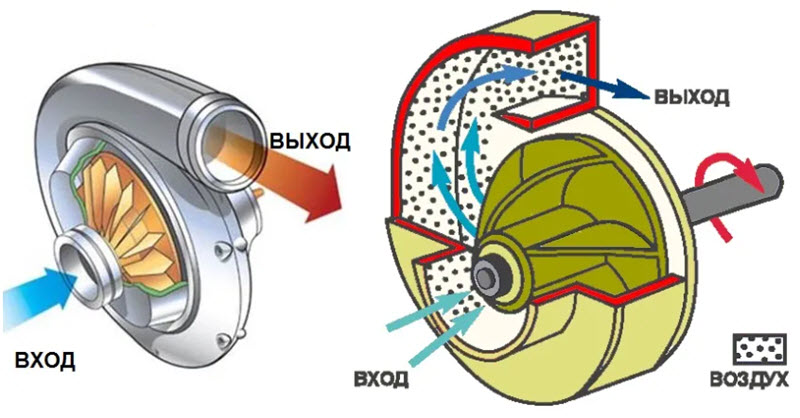 Принцип действия центробежного нагнетателя: воздух проходит по воздушному сужающемуся каналу и раскручивает лопасти крыльчатки. Раскрученные лопасти, ведомые центробежной силой, отбрасывают воздух на периферию кожуха. Там установлен диффузор, снижающий потери давления. Порой он имеет лопатки с регулируемым углом атаки.