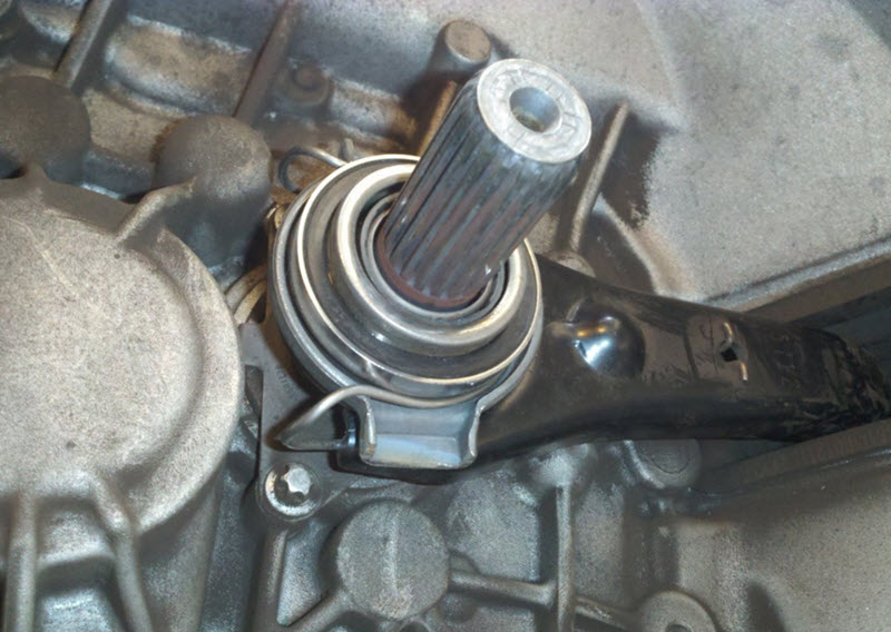 Лучше всего полностью снять коробку передач. После этого замена выжимного подшипника не вызовет трудностей: он легко снимается с направляющей, и на его место устанавливается новая деталь.