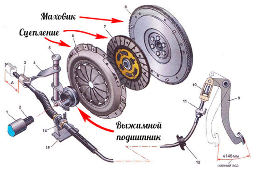 К таким элементам относятся вилка, её опора, сальник первичного вала, опорный подшипник на торце коленвала и маховик.