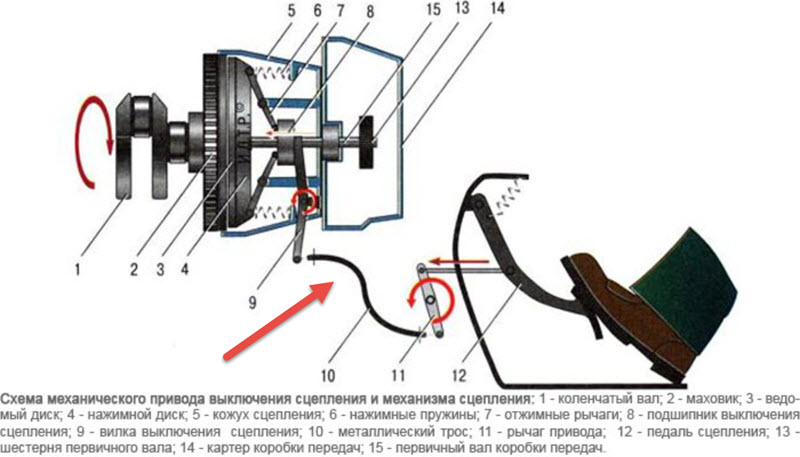 При механическом управлении педаль обычно соединена с тросом оболочки, который передает усилие на вилку выжима.