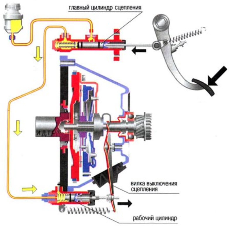 Гидравлическая жидкость, поступающая из главного цилиндра сцепления, создает давление на поршень. К недостаткам данного решения можно отнести усложнение конструкции, увеличение стоимости и потребность в регулярном обслуживании гидравлической системы.
