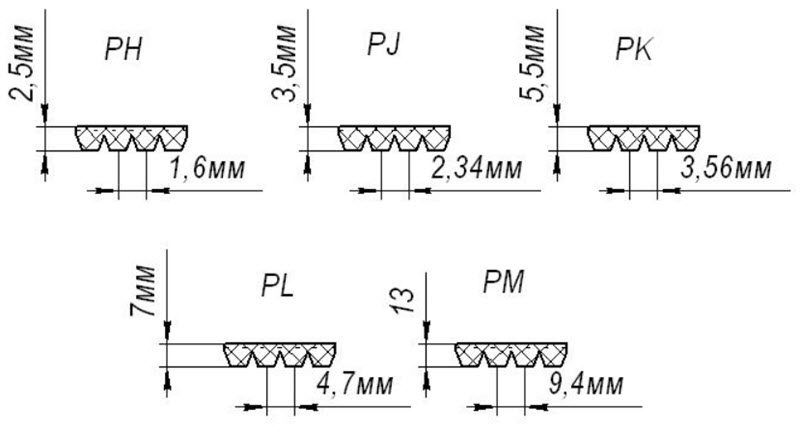 Большинство ремней, используемых в легковых автомобилях, имеют стандартную толщину плоского поликлина 5,5 мм, что обозначается буквами PK. При этом шаг составляет 3,56 мм.