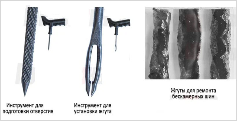 Суть процесса заключается в том, что в место прокола вставляется специальный липкий жгут, который герметизирует утечку воздуха. Если все сделано правильно, жгут надежно фиксируется внутри шины. Существуют различные виды жгутов: армированные кордом с внешней пропиткой или резиновые, которые требуют активации или просто вклеиваются.