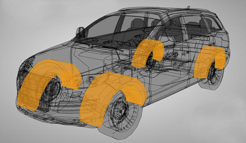С внешней стороны автомобиля необходимо обеспечить звукоизоляцию на уровне брызговиков, которые должны быть обращены внутренней стороной к кузовному пространству. Однако и крылья также требуют обработки, так как они могут излучать звук наружу, который затем проникает в салон через внешние панели. Таким образом, следует покрыть всю область колёсной ниши.