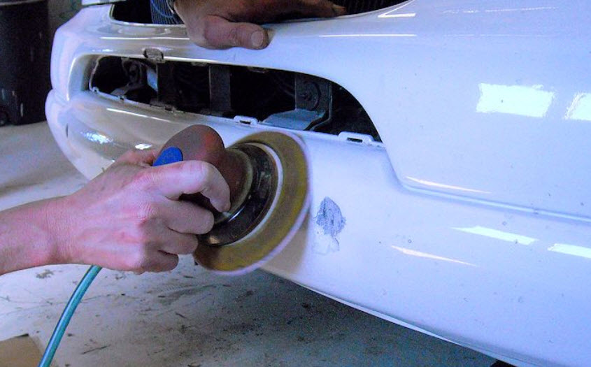 - Начните с обработки всей площади бампера с помощью грубой наждачной бумаги, используя наждачный круг и шлифовальную машинку.