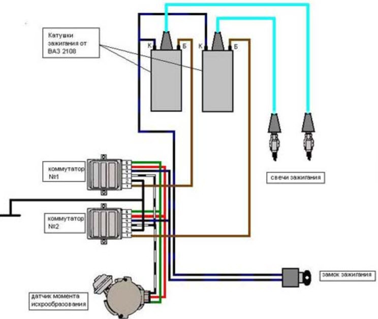 Разряд будет происходить через две свечи одновременно, при этом вторая свеча не создаст помех, так как такт выпуска происходит при низком давлении. Два коммутатора также повысят надёжность системы.