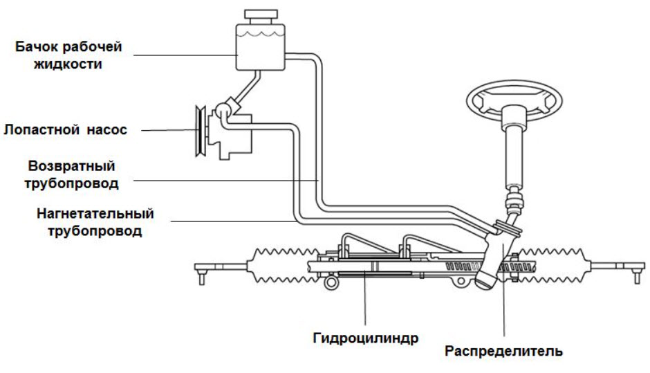 Гидронасос, который может быть лопастного или плунжерного типа, создаёт высокое давление масла, которое затем направляется через армированный шланг к распределителю. Этот распределитель управляет тем, на какую сторону поршня рабочего цилиндра будет подаваться жидкость, чтобы компенсировать реактивные усилия от колес, воздействующие на руль.